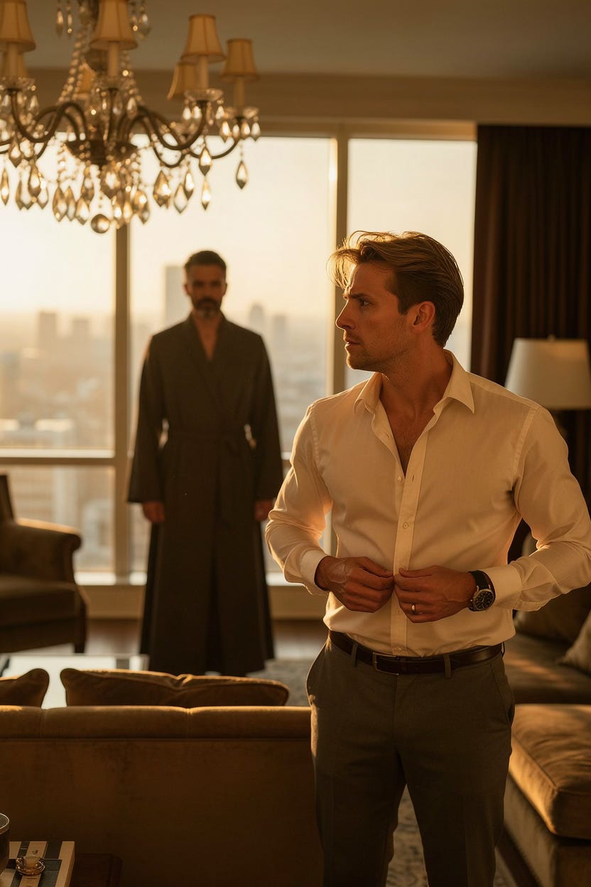 The door sighed open for him and closed behind him with a quiet, final click. The hallway was a silent, carpeted tunnel. He found the elevator, his fingers trembling as he pressed the button for the lobby. The descent was a slow, sinking feeling in his gut. The mirrored walls showed him a man in a rumpled suit, his hair tousled, a faint, unfamiliar scent of cedar and clean, male skin clinging to his collar. He looked exactly like what he was: a man leaving a place he did not belong.