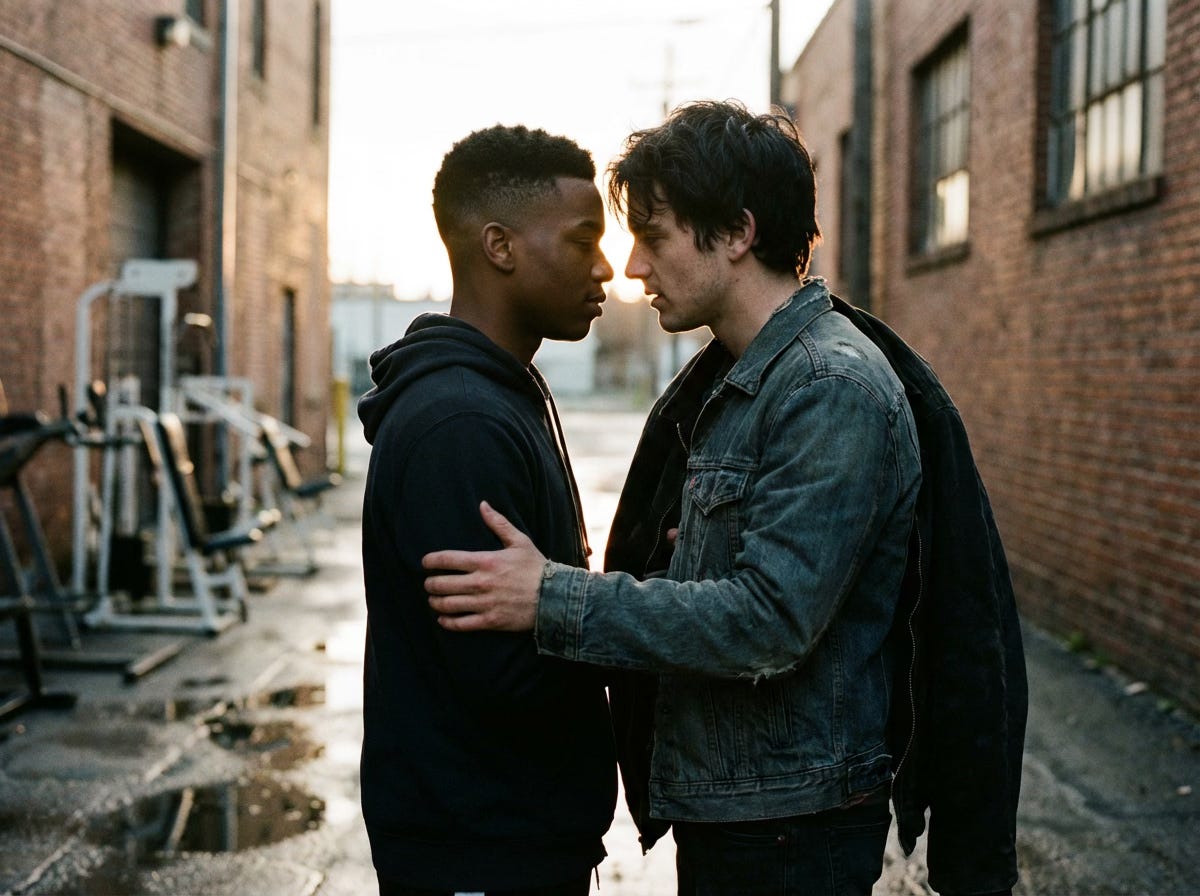 I grab the front of his hoodie with both hands and pull him into me like I’m trying to climb inside his chest. The kiss turns hungry in a second, like he’s been starving too and he’s been pretending he hasn’t.