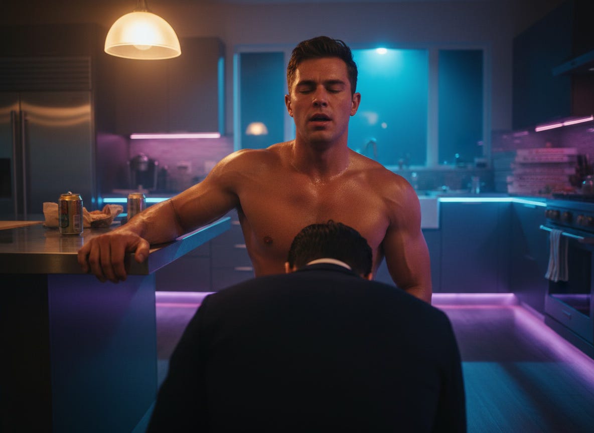 He laughs, and I join him, the sound echoing in the hollow kitchen. We drink, not looking at each other, just letting the moment settle. When I finally look up, his eyes are locked on me, and there’s no anger left, just an open, raw hunger.