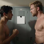 Taron scanned the room and spotted Ryan at a locker in the corner. Ryan was pulling his tank top over his head in one smooth motion, revealing a torso that made Taron’s mouth go dry despite having watched him work out for weeks. Defined pecs, abs that showed clear separation, the lean muscle of an athlete. His skin was pale, slightly flushed from the workout, and Taron could see his chest rising and falling with his breathing.