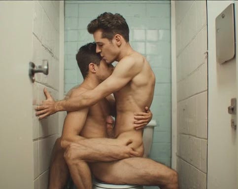 Noah knocked once, more habit than announcement, and pushed the door open. Adrian sat on the closed toilet, jacket folded with unnatural precision over the tank, sleeves rolled, tie loosened just enough to suggest effortlessness. His cock was already out, rigid and flushed, bobbing slightly in time with the steady, unrepentant beat of his heart.